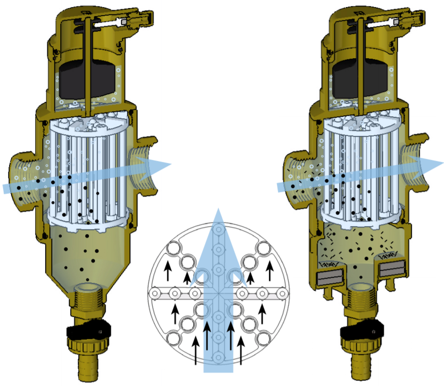 Lixo retido através de barras de filtragem especificas, acumulando o lixo na parte inferior do Purgador-Filtro facilmente limpavel atraves da torneira de descarga.
