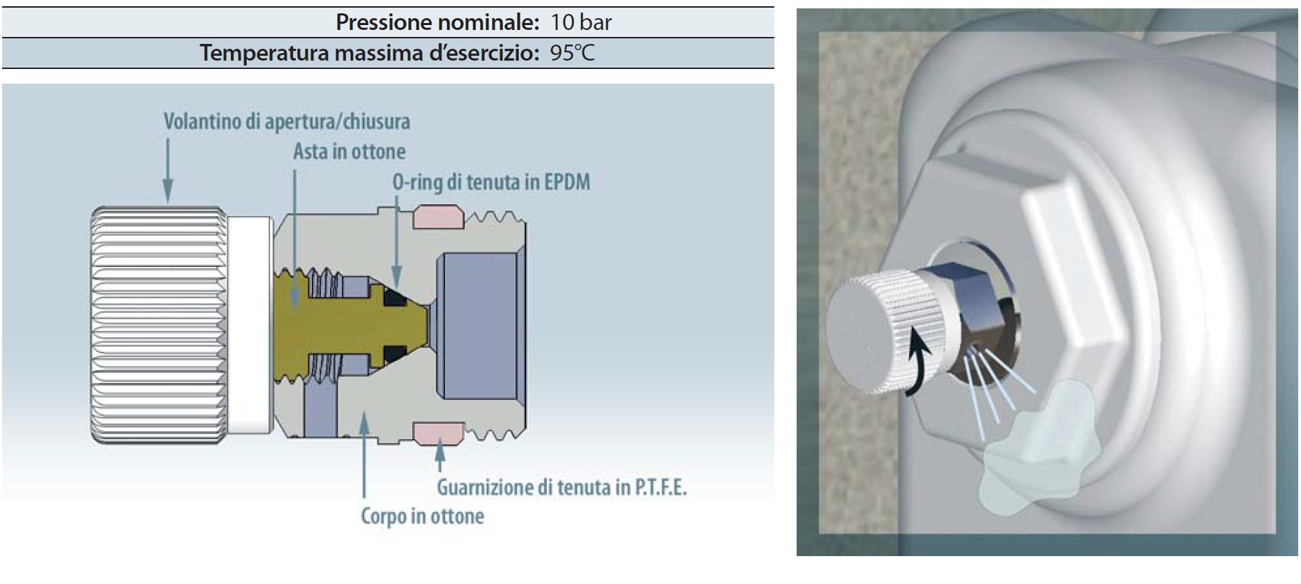Purgador para radiador de facil purga e longa durabilidade, graças a sua roda de aperto/desaperto. - Interior do purgador em latão - Temperatura máxima - 95 Cº - Pressão Máxima - 10 bar